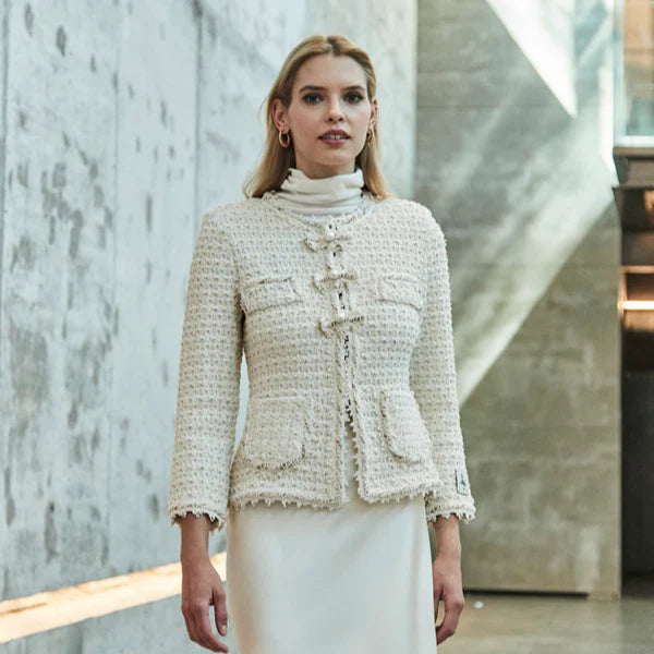 LA CHAQUETA TWEED LAZOS, una pieza que aúna la elegancia clásica del tweed con detalles contemporáneos y femeninos. Esta chaqueta tweed corta de manga francesa , con su meticulosa mezcla de algodón adornado con pailletes, se presenta como una obra maestra de textura y brillo sutil, perfecta para cualquier ocasión.