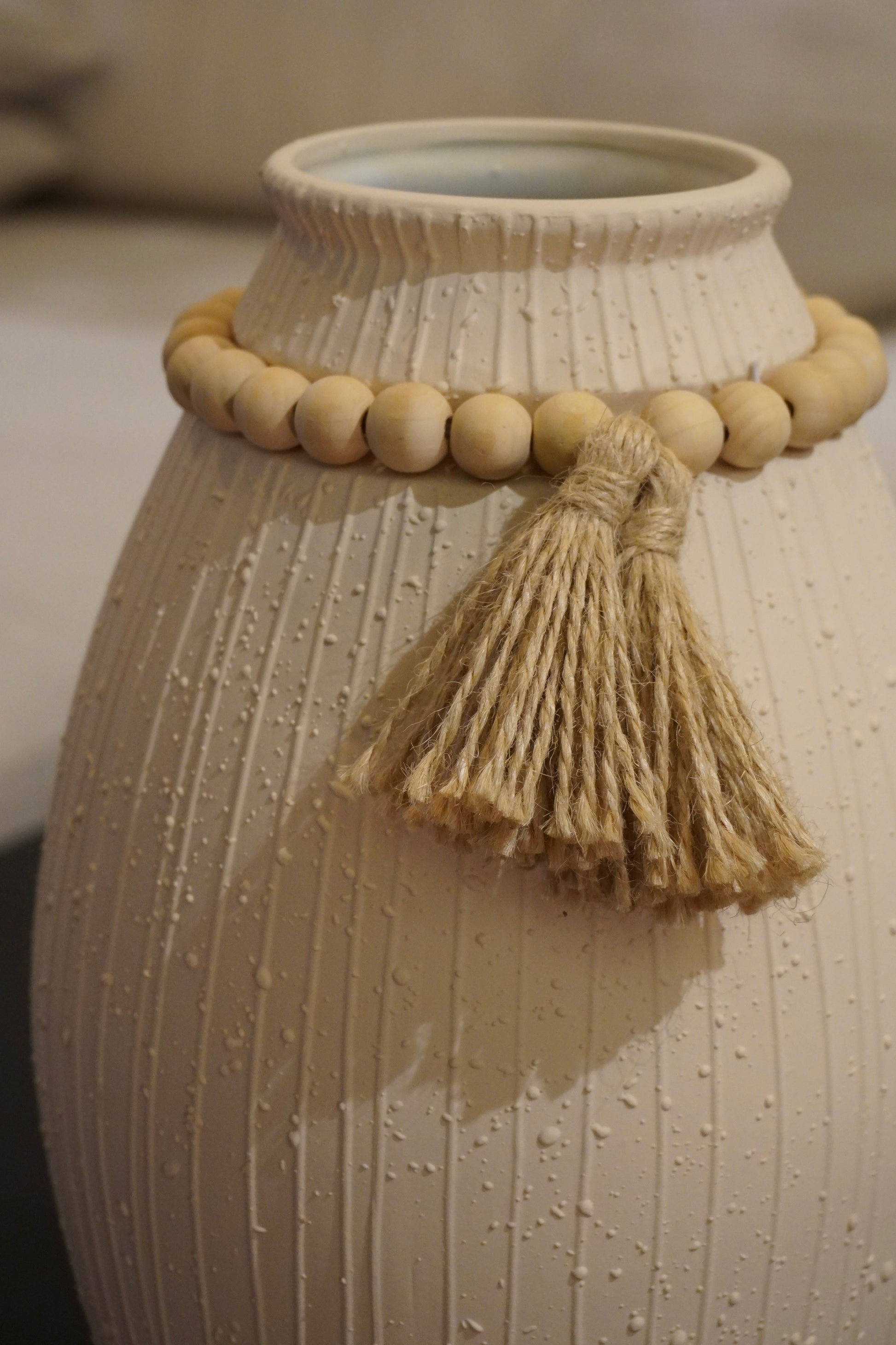 Este florero de magnesio con cuerdas es una pieza decorativa que transmite calma y autenticidad. Su acabado mineral en tonos neutros, junto con detalles en cuerdas naturales trenzadas, crea un equilibrio perfecto entre lo rústico y lo contemporáneo.