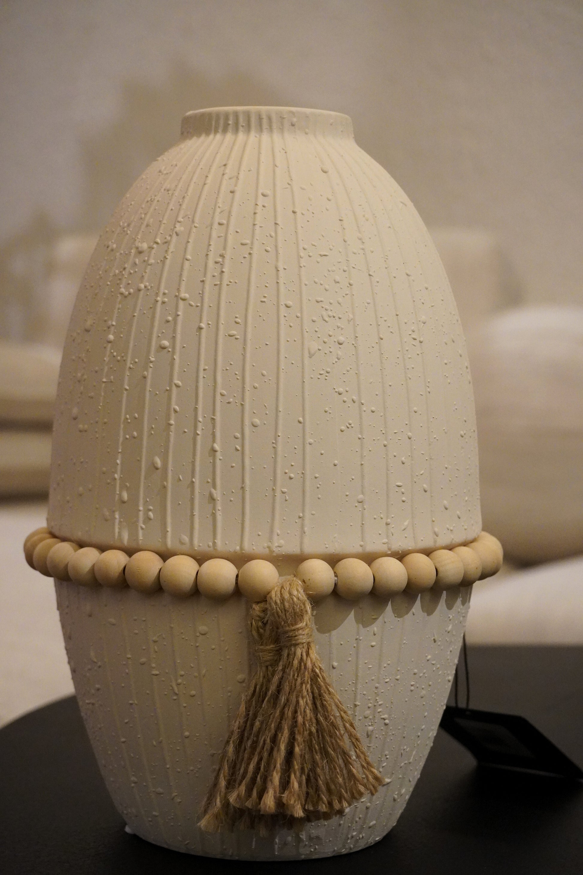florero de magnesio con cuendas combina la solidez de los materiales minerales con el encanto rústico de los detalles naturales. Fabricado en magnesio, un material ligero y resistente de acabado cerámico, y decorado con cuendas (cuerdas decorativas), este florero aporta un aire artesanal y orgánico a cualquier espacio.