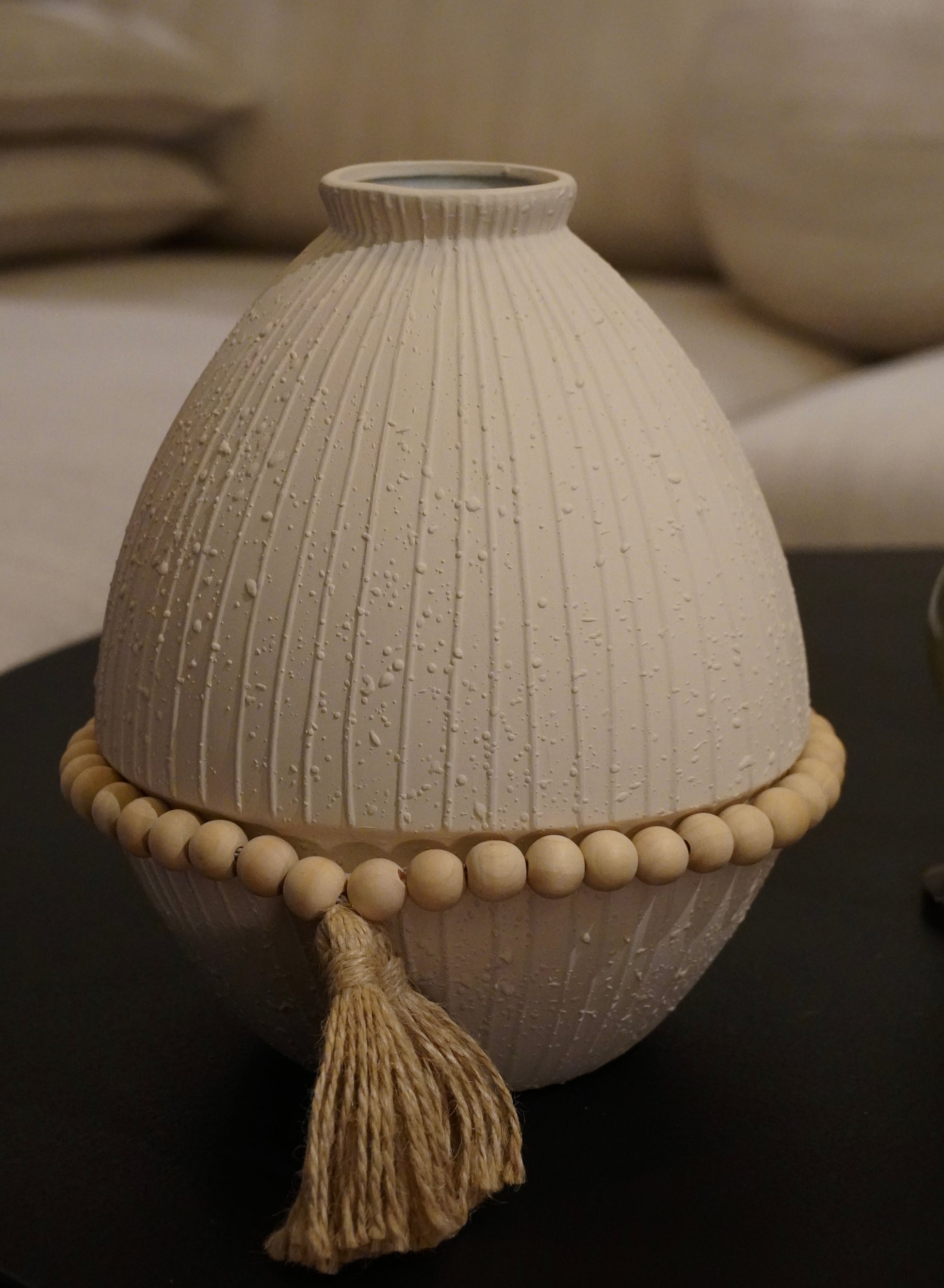 Este florero de magnesio con cuendas destaca por su estética natural y atemporal. Su estructura de magnesio, con acabado mate y textura ligeramente rugosa, aporta un aire sobrio y contemporáneo, mientras que las cuendas decorativas en fibras naturales añaden un contraste cálido y artesanal.