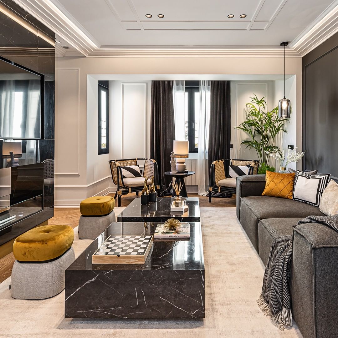 Sofisticado puff de diseño Art Decó e inspiración vintage tapizado en la parte superior en color mostaza con detalle de botón y en la parte inferior en beige y crudo, separa los colores elegante aro metálico central en color negro mate.
